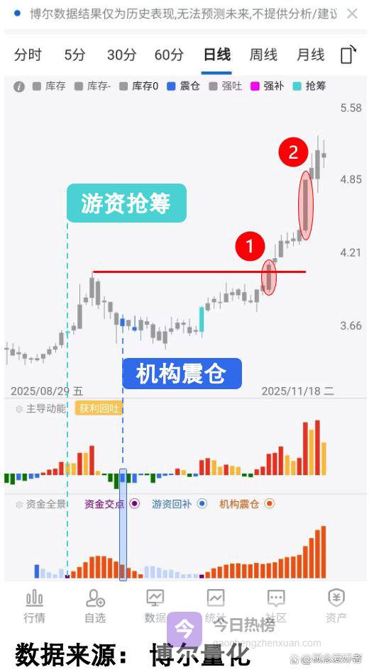 一、传统走势里的“视觉盲区”很多人观察个股,仅聚焦于表面的涨跌走势。就拿某只个股来说,多数人会在股价涨停的节点关注到它,可跟进后就陷入震荡,甚至被动持有;也有人在股价突破前期高点时进场,却因震荡波动早早离场,最终并未把握到核心的行情阶段。但这些都是走势的表象,真正的关键信号藏在“交易行为的深水区”,只有换用量化数据的视角,才能发现不一样的线索。看图1: