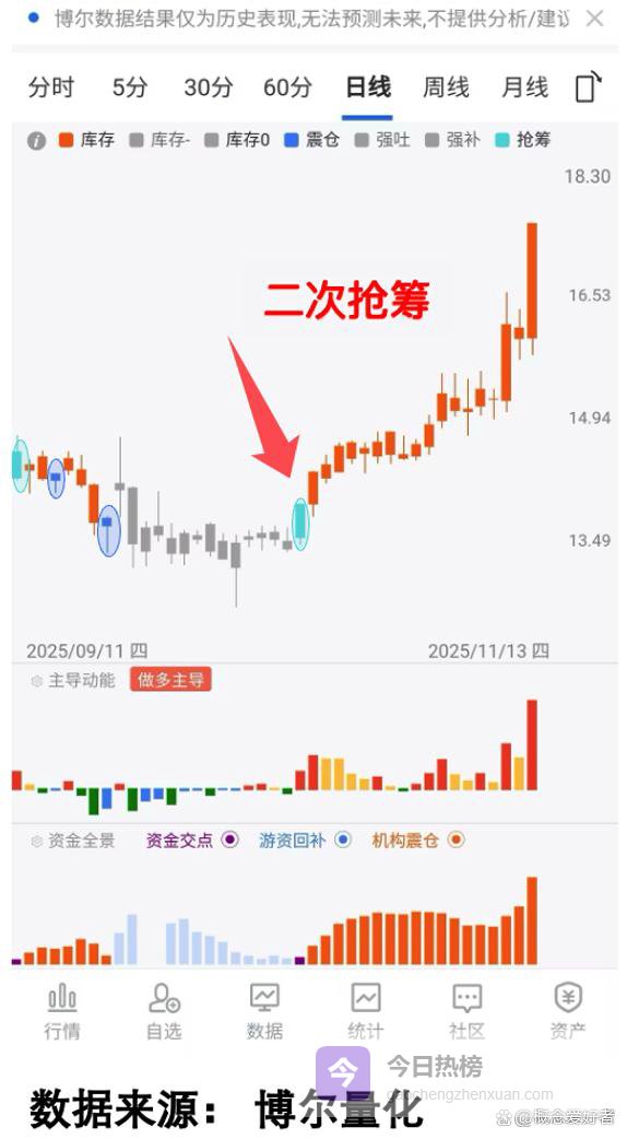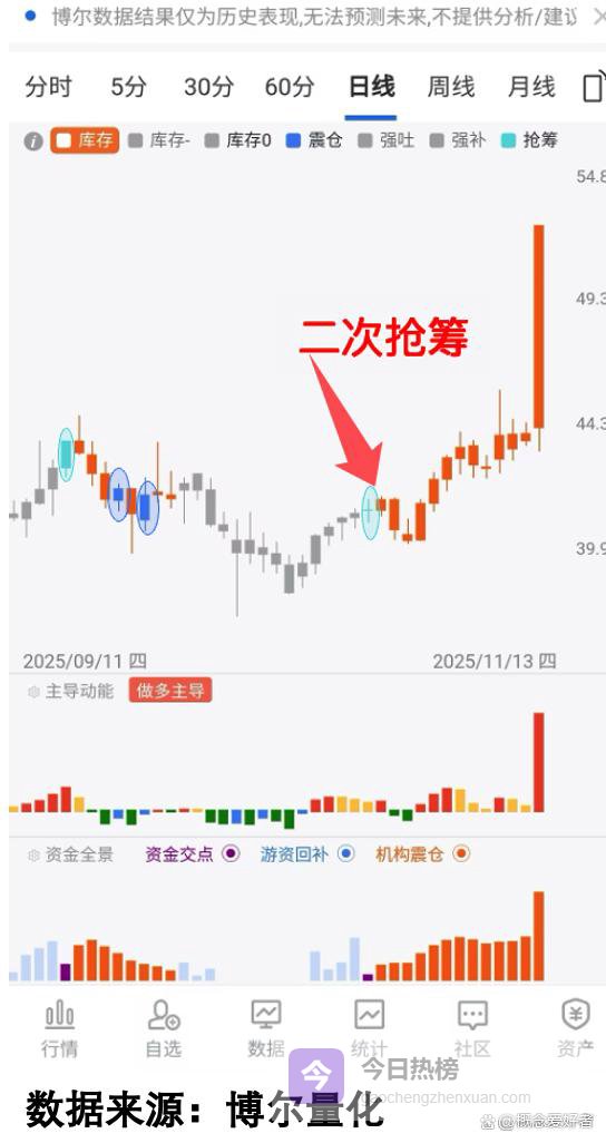 从图中能清晰看到,第一次「游资抢筹」出现后,股价短暂上行便进入震荡阶段,而震荡过程中连续出现两次「机构震仓」信号,这说明调整并非资金撤退,而是机构故意打压以清理浮筹。当调整进入低位阶段,第二次「游资抢筹」信号出现,此时机构不愿再继续打压,只能顺势推动股价上行,这就是「二次抢筹」的核心行为逻辑。三、「二次抢筹」的市场普遍性验证这种「二次抢筹」的行为逻辑并非个例,在不少个股身上都能找到清晰的痕迹。比如这只个股,同样是第一次「游资抢筹」后遭遇震荡洗盘,「机构震仓」信号明确出现,随后游资在低位再次进场,触发第二次「游资抢筹」,之后股价进入上行阶段。看图3: