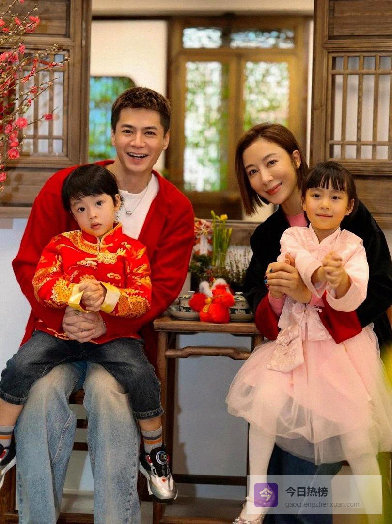 这次他们挑了个很巧的构图,爸妈坐在椅子上送祝福,姐弟俩在窗台后探出脑袋,两个小脑袋一左一右,露着整齐的小白牙,画面不用修饰就有年味