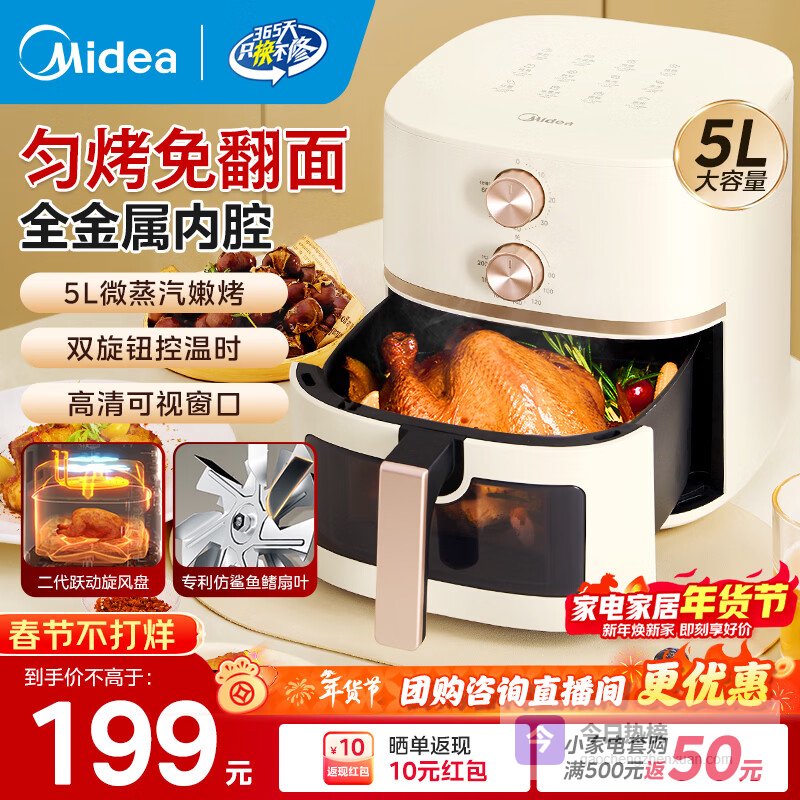 美的(Midea)空气炸锅不用翻面可视大容量家用全自动烤箱多功能不粘易洗触控微蒸汽嫩烤免翻面炸烤一体 KZE5089【双旋钮控温时丨免翻面】 5L¥