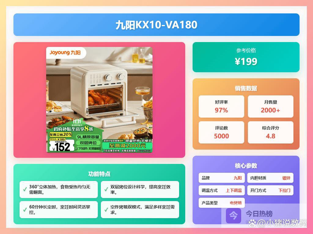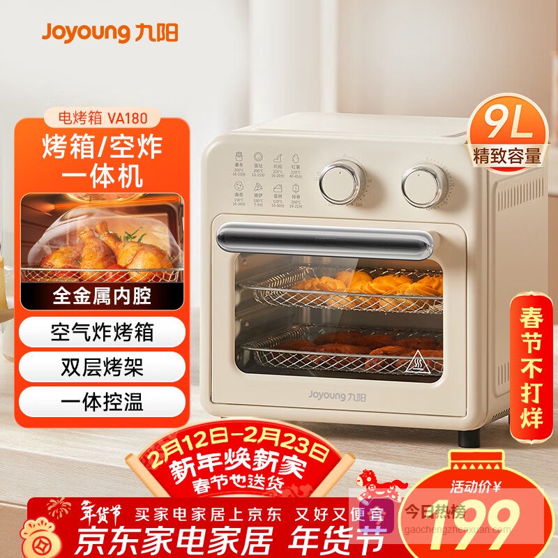 第1款:九阳KX10-VA180一机多种用途:这可不是单纯的烤箱,空气炸功能是真不错,平时想吃个炸鸡翅、炸薯条啥的,不用放很多油,就能做出酥脆的口感,比外面买的还健康。而且还能烤面包、披萨,感觉买了它,家里的早餐机、微波炉都可以退休了,一台顶多台,确实省地方。