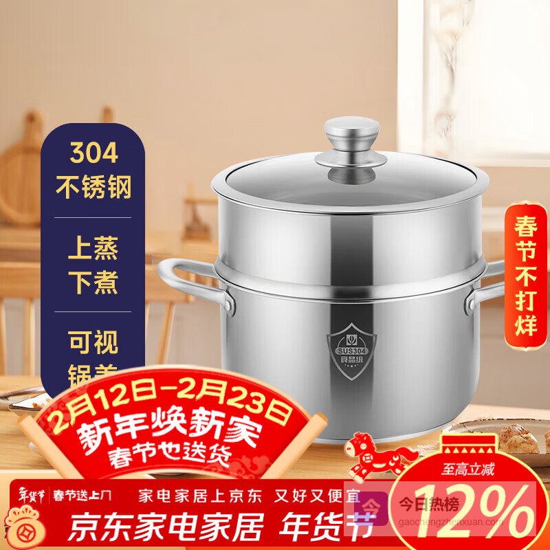 【京东自营】国风304不锈钢复底带蒸格汤锅24cm蒸煮炖一锅多用防烫手柄煤气电磁炉¥