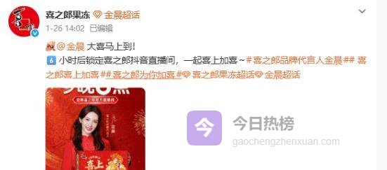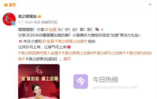 要说这反转,来得那叫一个猝不及防。就在这个月头,1月7号,喜之郎官博还敲锣打鼓地置顶官宣,把金晨捧成了“喜上加喜”的新晋代言人,连着半个月又是发博庆祝她出道十五年,又是各种互动,亲热得跟一家人似的。这才过了二十多天,怎么就上演“删除拉黑”的戏码了?