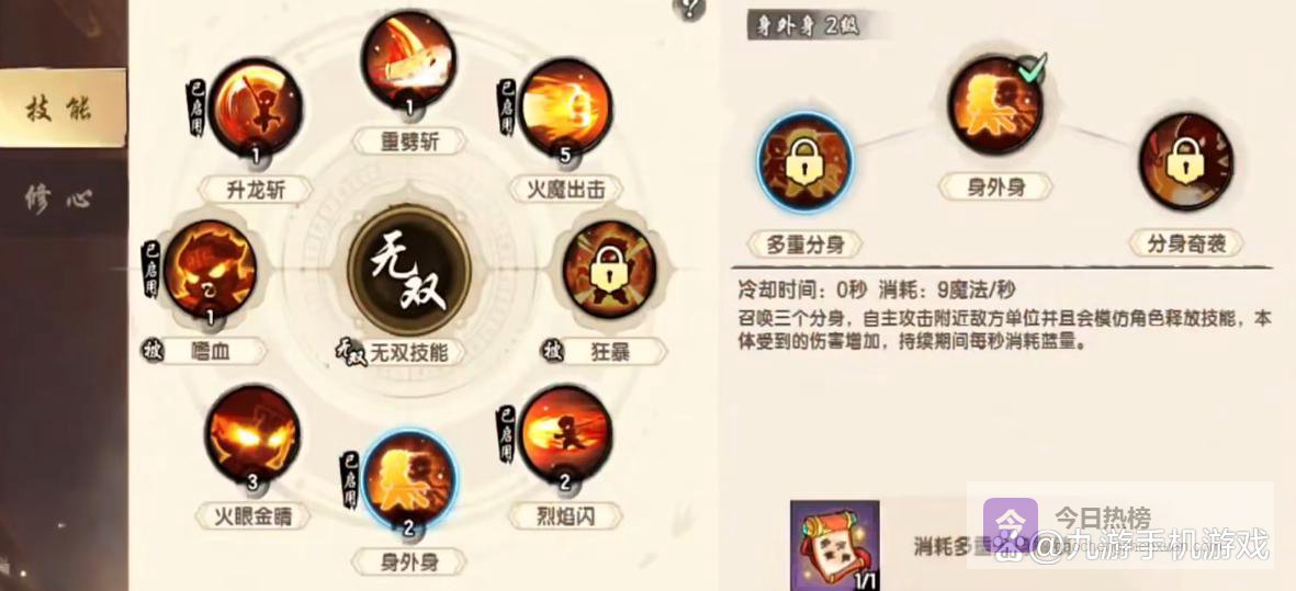 游戏中玩家选择了什么身份,接下来整个游戏过程中就都要以这个身份来完成。对于孙悟空这个角色而言,要根据他的技能来展开。孙悟空的技能特点就是攻击技能特别多,有针对单体目标的攻击技能,也有针对群体攻击的技能。在游戏前期建议先升级单体攻击技能,后续开启了副本玩法之后,开始升级群体攻击技能。