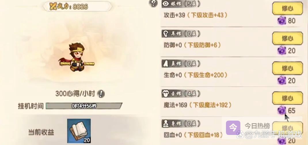 在角色的养成上,不仅要注重角色的技能升级,同时也要注意修心玩法,尤其是选择了孙悟空的玩家,这个角色在防御上和血量上会略显不足。