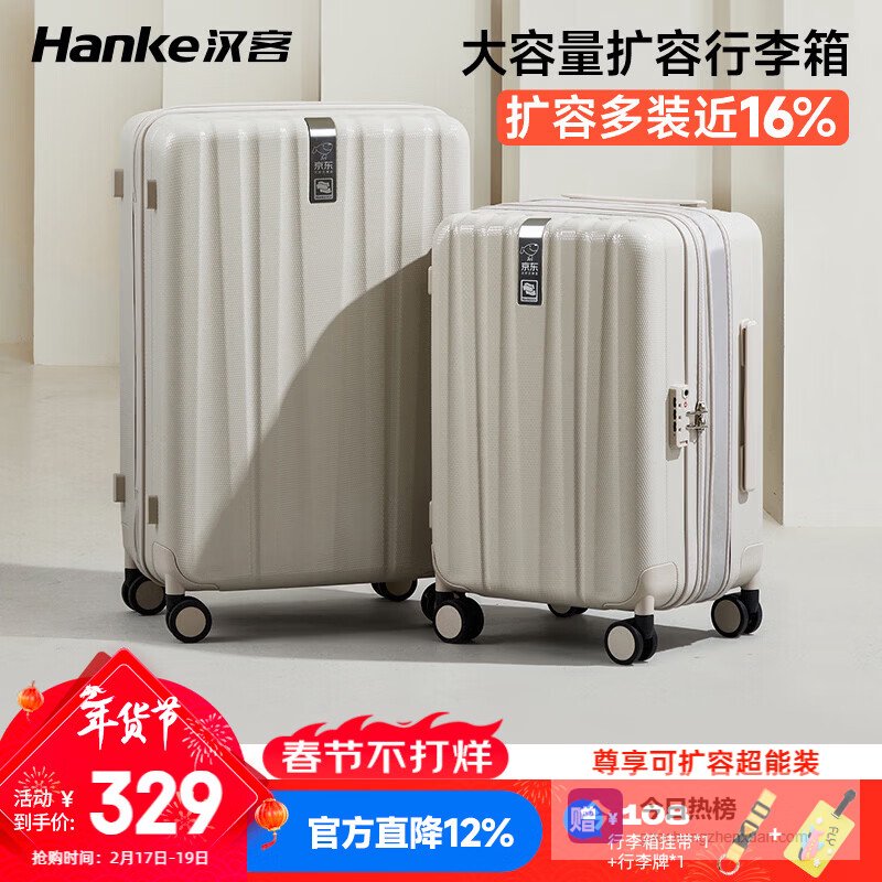 【京东自营】汉客扩容行李箱男京东联名款拉杆箱女象牙白20英寸大容量登机旅行箱¥