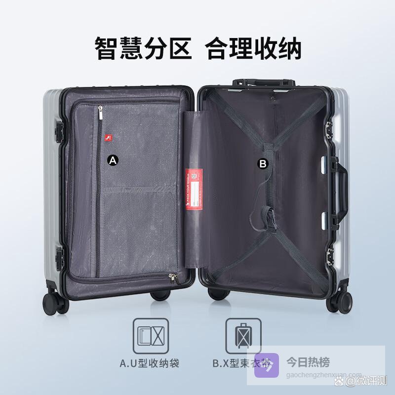 为了满足不同收纳需求,这款行李箱采用了智慧的分区设计。箱体四边R角设计释放更大空间,左侧双层拉链袋将细小物品整理得井井有条,保护隐私,而右侧的型束衣袋则能有效固定更多行李。不论是商务文件还是个人衣物,都能轻松收纳,让旅行更为轻松愉快。