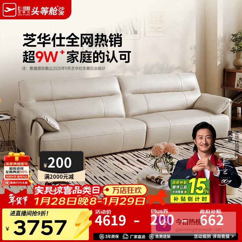 【品牌直营】芝华仕真皮艺沙发客厅2025新款黑色小户型直排钢琴键芝华士3095棉白色-摔纹进口头层皮¥