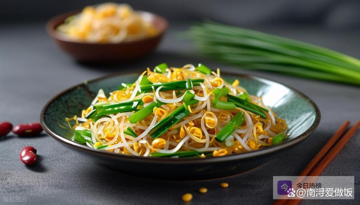 3. 锅中再加少许油,放入葱丝和蒜末小火煸香,倒入绿豆芽大火快速翻炒至微软出水。