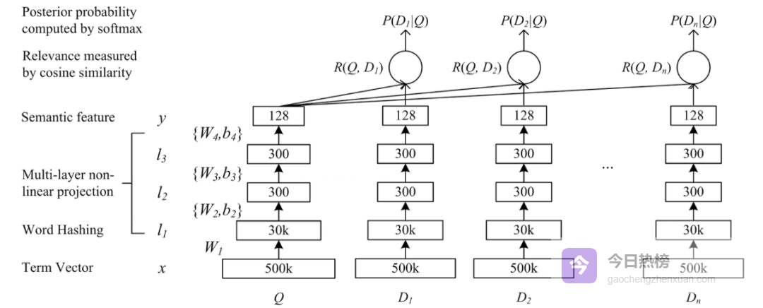 Multi-layer nonlinear projection:三层DNN继续压榨维度,3万→300→128,把语义浓缩成128个数。