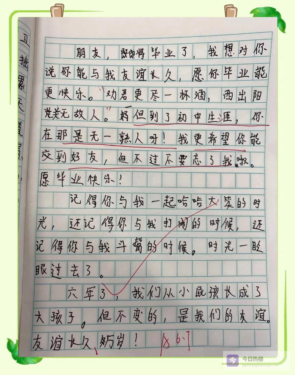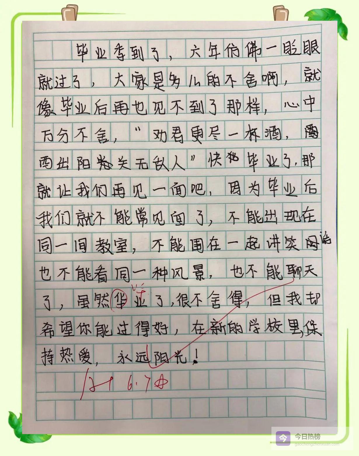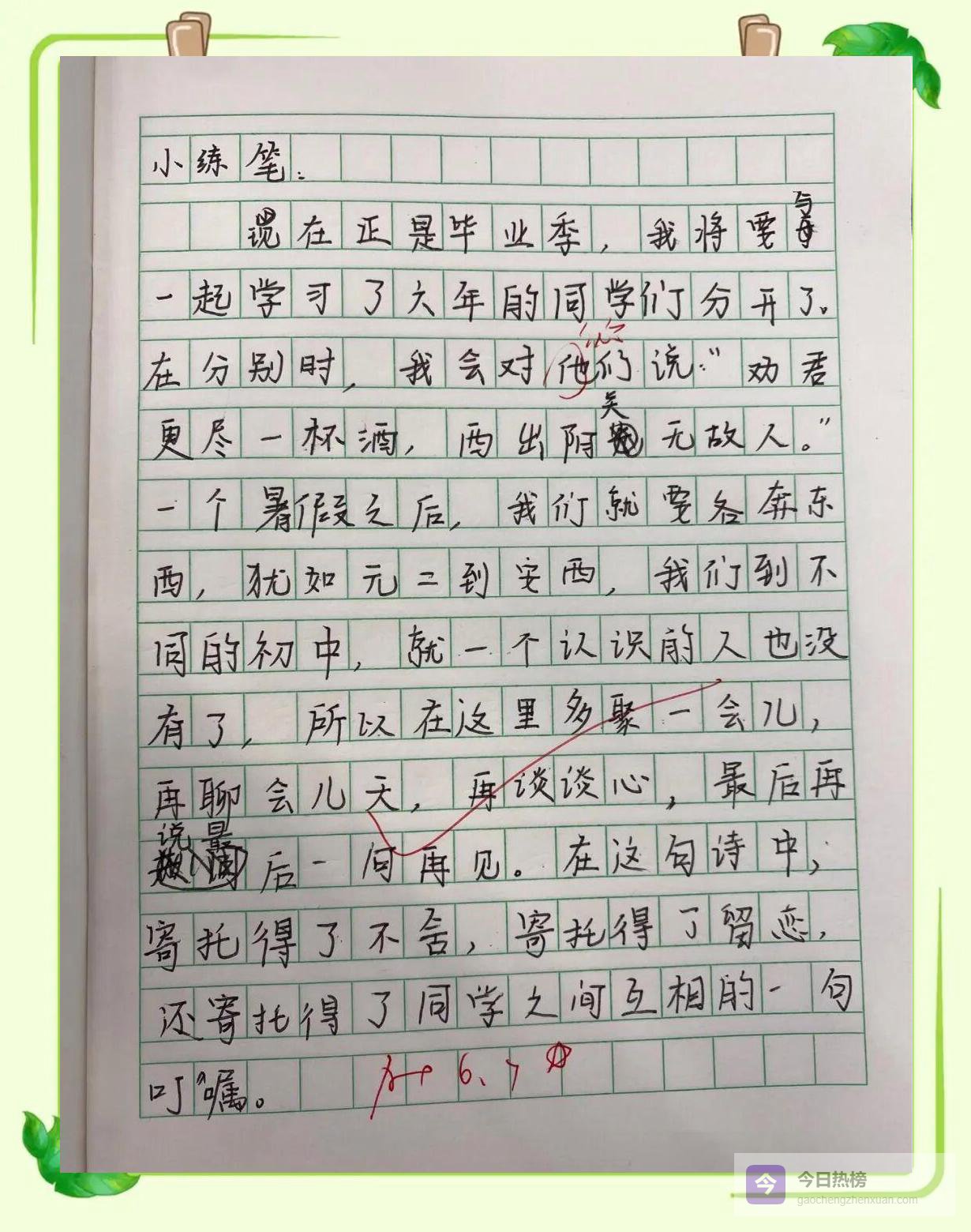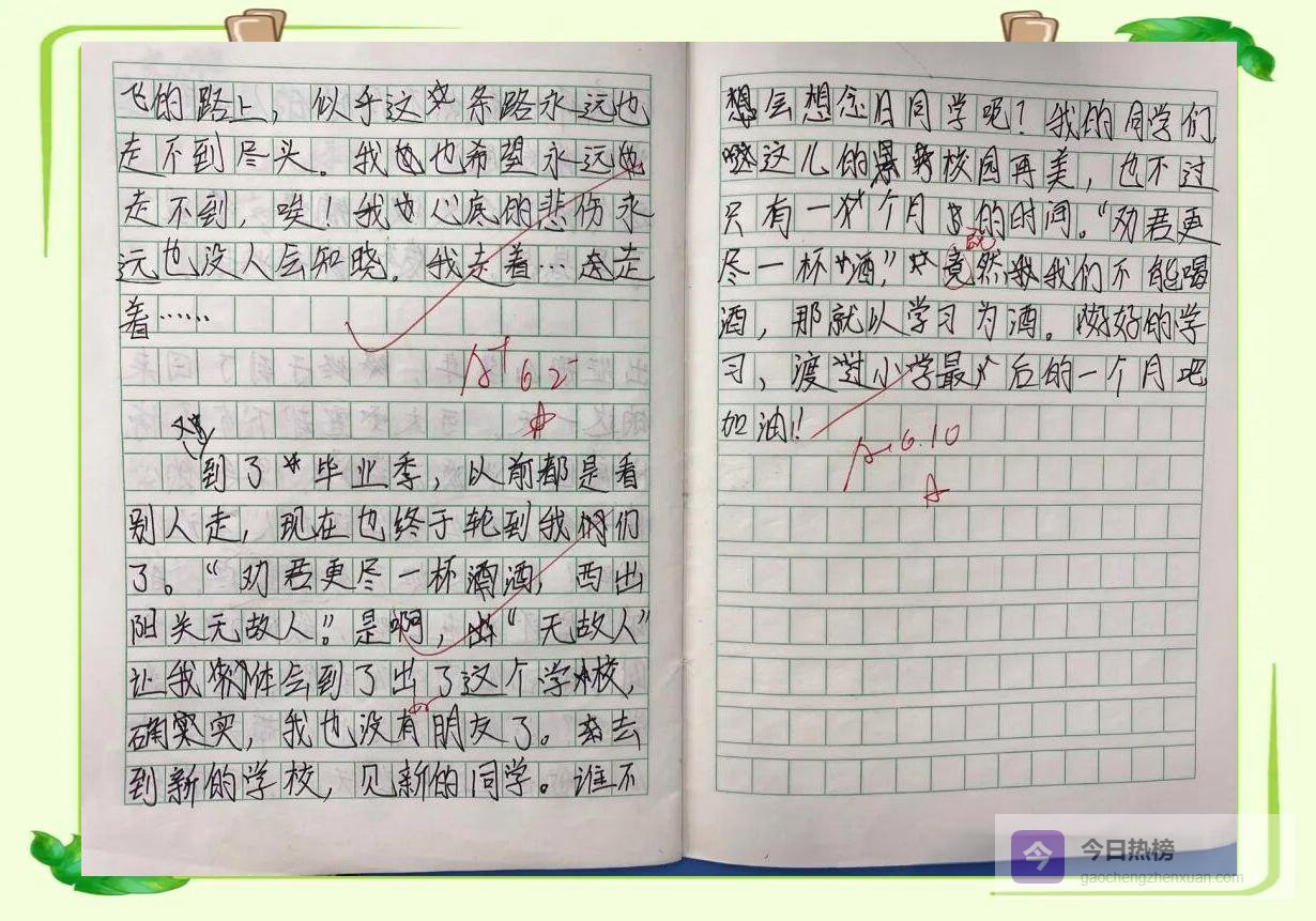作业是:化用《送元二使安西》,写一首属于六年级的毕业诗。第二天早上,作业本像一群不会说话的小鸟落在讲台上。老师翻开第一页——“劝君更进一杯酒,西出阳关无学霸”——全班哄笑;再翻一页——“莫愁前路无知己,天下谁人不刷题”——笑声更猛;最后一页是一首很正经的诗——“城门外,长亭晚,凤凰花落声声慢;举杯祝,君武运昌隆,我们顶峰再见”——老师读完沉默三秒,鼓掌三秒,全班跟着鼓掌三秒。掌声停住,凤凰花瓣又飘了一片。
