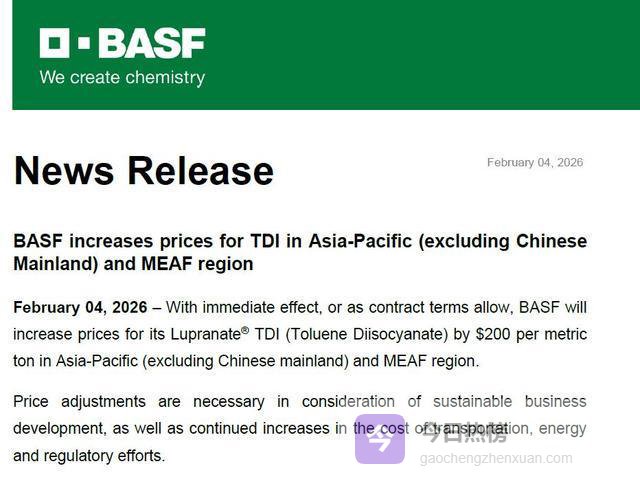 全球化工巨头巴斯夫近期宣布,对亚太地区TDI产品提价200美元/吨(涨幅近11%),但中国大陆市场被排除在外。这一反常操作,真的是对华让利?实则是全球化工话语权转移的直白信号。