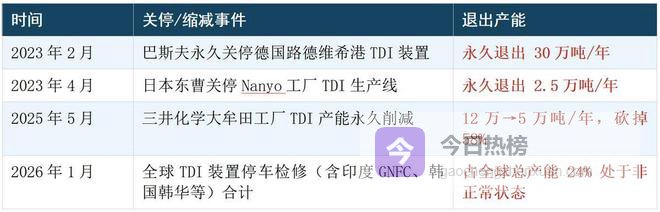 很多人误以为巴斯夫绕开中国是让利,实则是其在华市场话语权丧失的无奈之举。当前海外TDI产能正遭遇前所未有的困境,据行业数据,截至2026年1月,全球TDI装置停产检修总量已占总产能的24%,这是三年来产能关闭潮积累的结果。