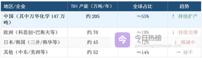 反观中国市场,TDI产能已占据全球半壁江山——年产能约205万吨,占全球总产能的55%。其中万华化学一家就拥有147万吨产能,规模超过整个欧洲。更关键的是,国内企业拥有完整产业链配套,万华烟台基地满负荷运行,沧州大化实现原料到成品的闭环生产,成本优势碾压海外同行。