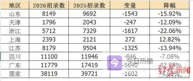 就在考公热度冲到沸点的时候,另一个数据却呈现出相反的走向。2026年国考招录名额不增反减,比去年少了1602人,这是7年来第一次出现缩编。省考缩招也紧随其后,四川减少约7%,江苏、山东、天津均超过10%,浙江达到了22%,广东则减少了大约1/3。