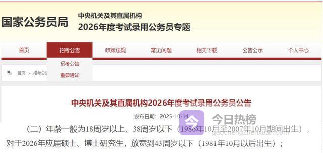 根据招考公告,报考者年龄一般要求18周岁以上、38周岁以下,对于2026年应届的硕士和博士研究生,放宽到43周岁以下。和以前规定的35周岁、40周岁相比,两类人群的年龄上限都放宽了3岁。
