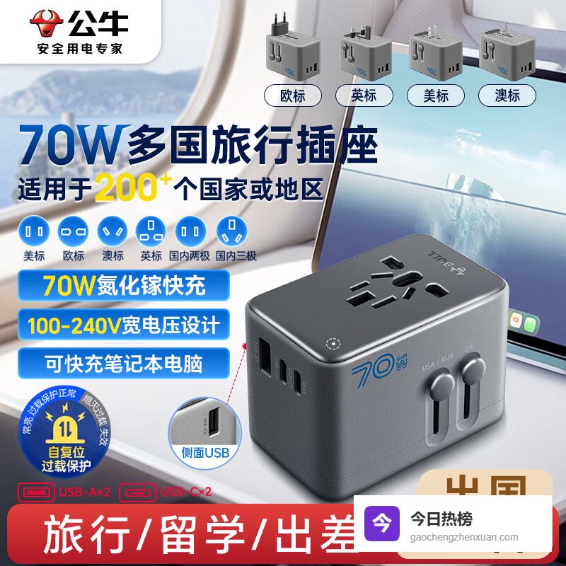 公牛(BULL)70W氮化镓快充多国插座畅行世界转换插头/出国旅行出差留学自带线防脱落多孔插头欧标美标澳标英标¥
