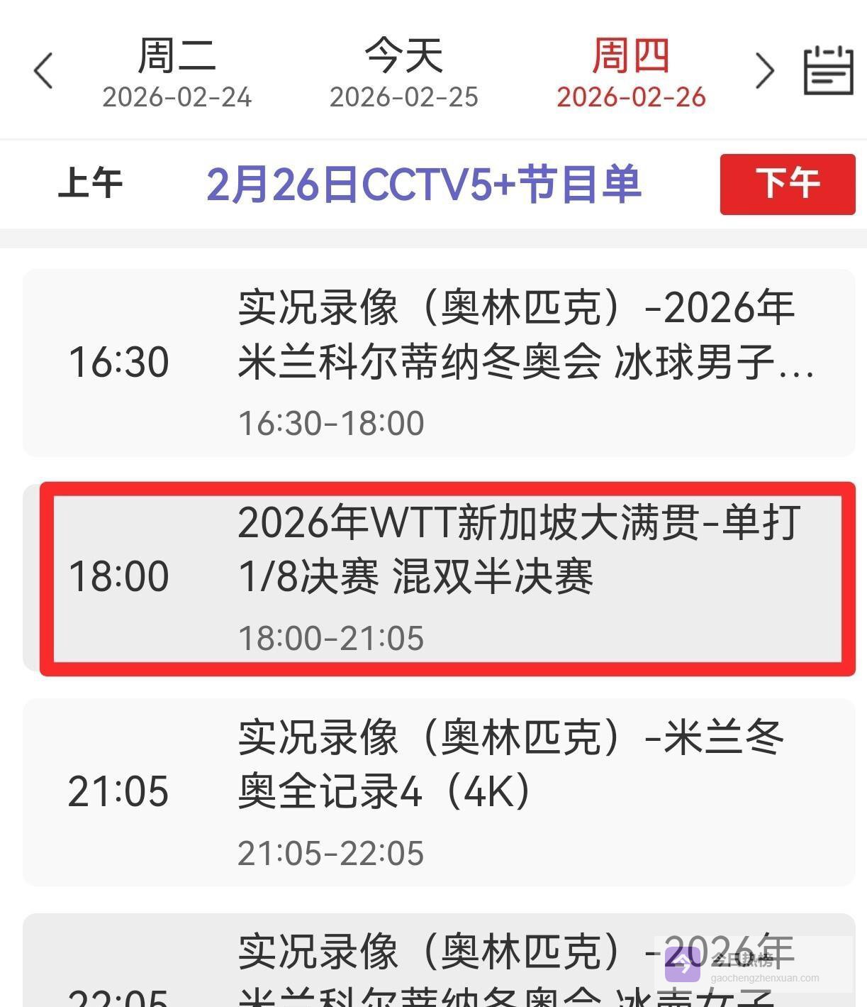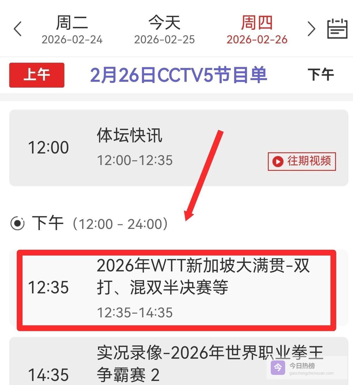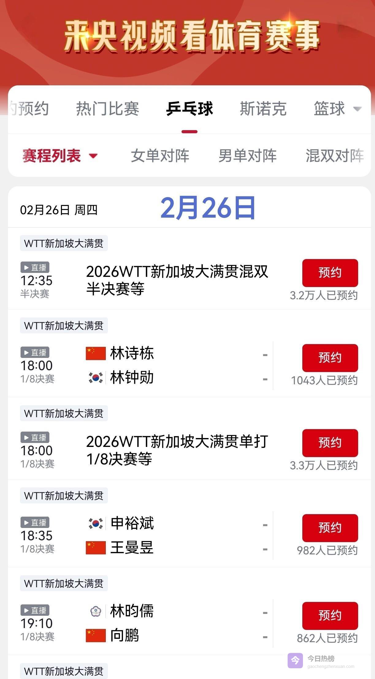 2月26日的比赛全部集中在晚间黄金时段,从18:00开始,国乒选手将接连登场。 由于同时段央视体育频道(CCTV5)需要直播中国男篮世界杯预选赛,因此乒乓球赛事直播调整至CCTV5+频道,时间为18:00至21:05。 午间12:35至14:35的时段,CCTV5将直播外协会的女双、男单及混双半决赛。