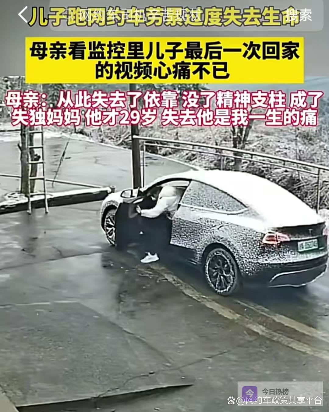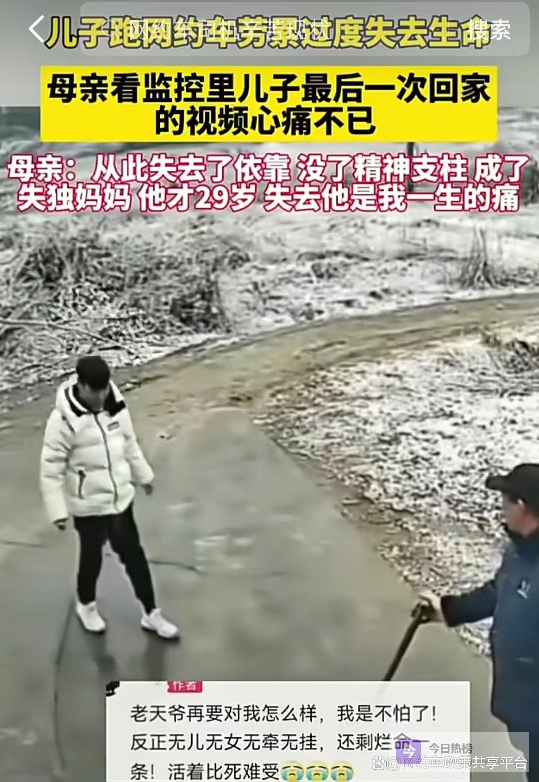 这位司机的母亲翻看监控时,翻到了他离世前最后一次回家的监控视频,那是他母亲最后一次看到活生生的儿子,面对镜头里熟悉的身影,母亲悲痛万分:从此我的依靠没了,精神支柱也倒了,我成了失独妈妈,他才29岁,失去他是我一生的痛,简单的几句话,道尽了一位母亲的锥心之痛。