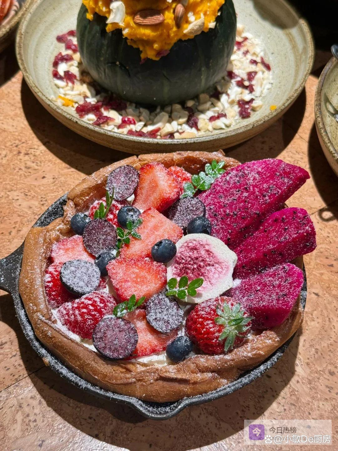 他们家的水果松饼是我的心头好。每次必点。松饼端上来还带着暖暖的温度,蓬松度刚好。我喜欢用手轻轻撕开下面那层饼皮,微微的韧劲里透出很自然的蛋香。搭配的新鲜水果清甜解腻,和朋友分食一个,总是吃得干干净净。