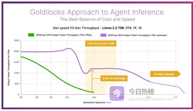 SambaNova表示,与SN40相比,SN50每个加速器提供五倍的计算能力和四倍的网络带宽。该公司表示,内部基准测试显示,与英伟达的Blackwell B200 GPU相比,SN50在运行像Meta的Llama 3.3 70B等模型的智能体推理工作负载时提供5倍的最大速度和超过3倍的吞吐量。