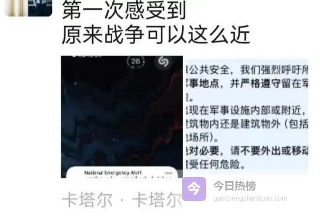 中国外交部紧急发布提醒:中国公民暂勿前往伊朗周边受到军事冲击的国家和地区;已在上述国家和地区的中国公民要进一步加强自身安全防范,避免前往军事设施、游行集会等敏感区域;如遇紧急情况,请及时报警并联系中国驻当地使领馆寻求协助。