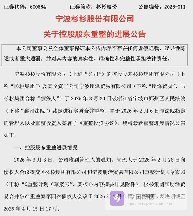 3月3日晚间,杉杉股份发布公告称,其控股股东杉杉集团有限公司及全资子公司宁波朋泽贸易有限公司的合并重整计划草案已于3月2日提交第四次债权人会议审议,表决截止日期为2026年4月15日17时。