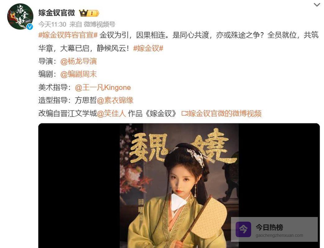 2026年1月22日古装剧《嫁金钗》官宣主演阵容,还放了首批角色剧照,刷到物料的时候我刚好在追古装剧剪辑,顺手点进去就没划走。这次发布的内容重点都在演员定妆造型和角色设定上,连阵容搭配都透着股精心打磨的劲儿。