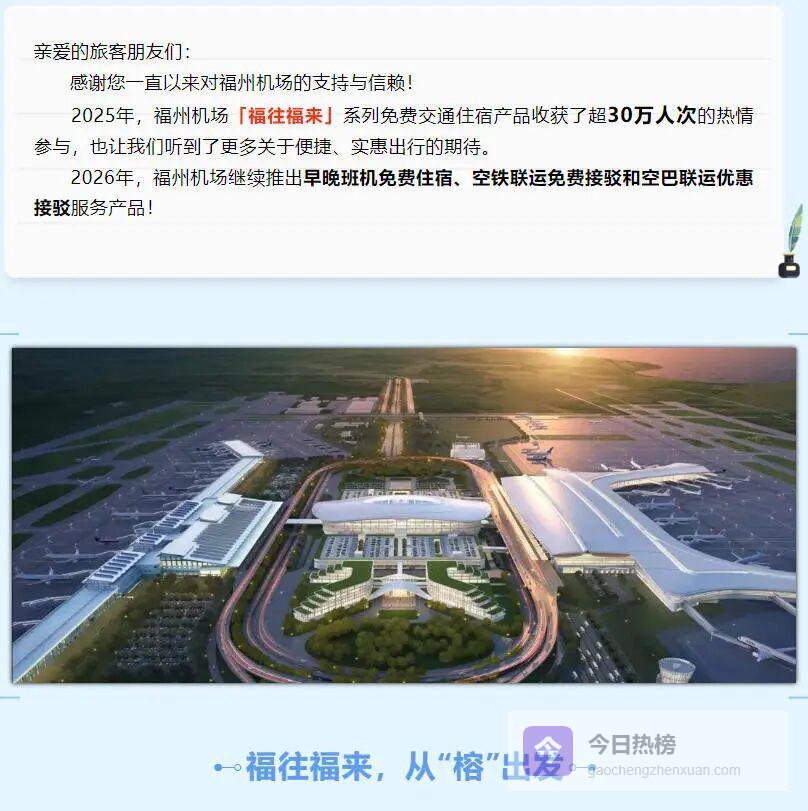 3月4日,福州机场发布公告,2026年将继续提供早晚班机免费住宿服务,只要是福州六区七县之外的福建、浙江、江西旅客,乘坐早上九点前起飞的航班,或晚上十点后降落的航班,都能凭机票和身份证在“指定酒店”享受一晚免费住宿。