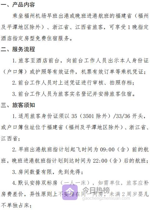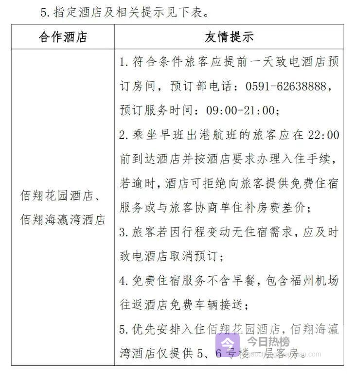 像福州新投格兰云天、东湖小镇云朵酒店等滨海新城的新建酒店,以及漳港街道、湖南镇等机场附近那么多的酒店,凭什么不能纳入指定范围呢?反正免费住宿服务还包含免费车辆接送,离机场多几公里完全不是问题。