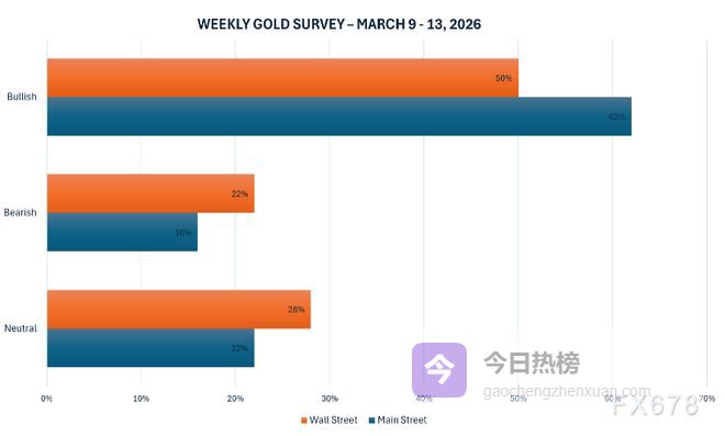 华尔街与主街分歧明显:50%分析师看涨后市,5000美元支撑“铁板一块”本周Kitco新闻黄金调查显示,华尔街意见严重分裂:18位分析师中,9位(50%)预计未来一周金价上涨,4位看跌,其余持中性。主街投资者情绪则回暖至2月初水平,62%的零售交易者看好未来一周进一步上涨。