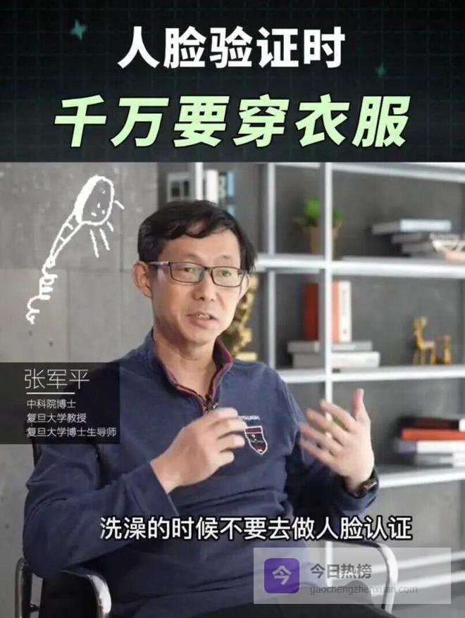 在那条5年前的科普视频中,张军平教授提醒大家,千万不要在洗澡的时候去做人脸认证。他说:“你确确实实要把衣服穿好,摄像头并不是只看到圆的这一块的内容,它其实全部都看到了,所以洗澡的时候不要去做人脸认证。”