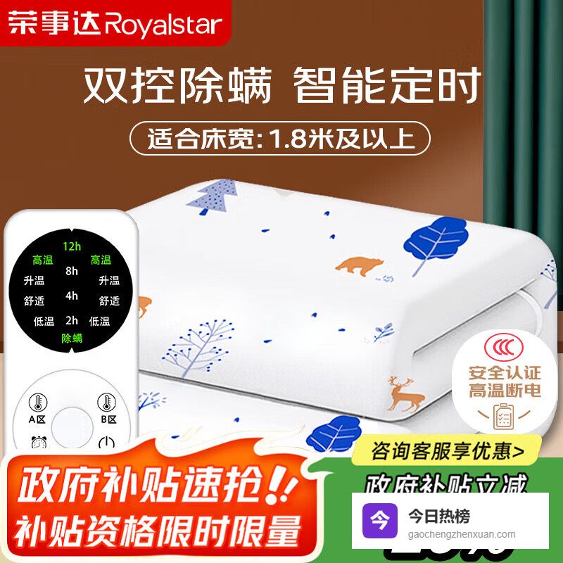 荣事达【高温断电】双人定时除螨双温双控无纺布电热毯电褥子2.0*1.8米¥