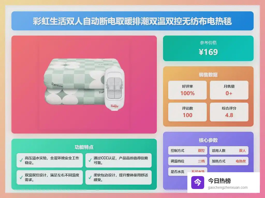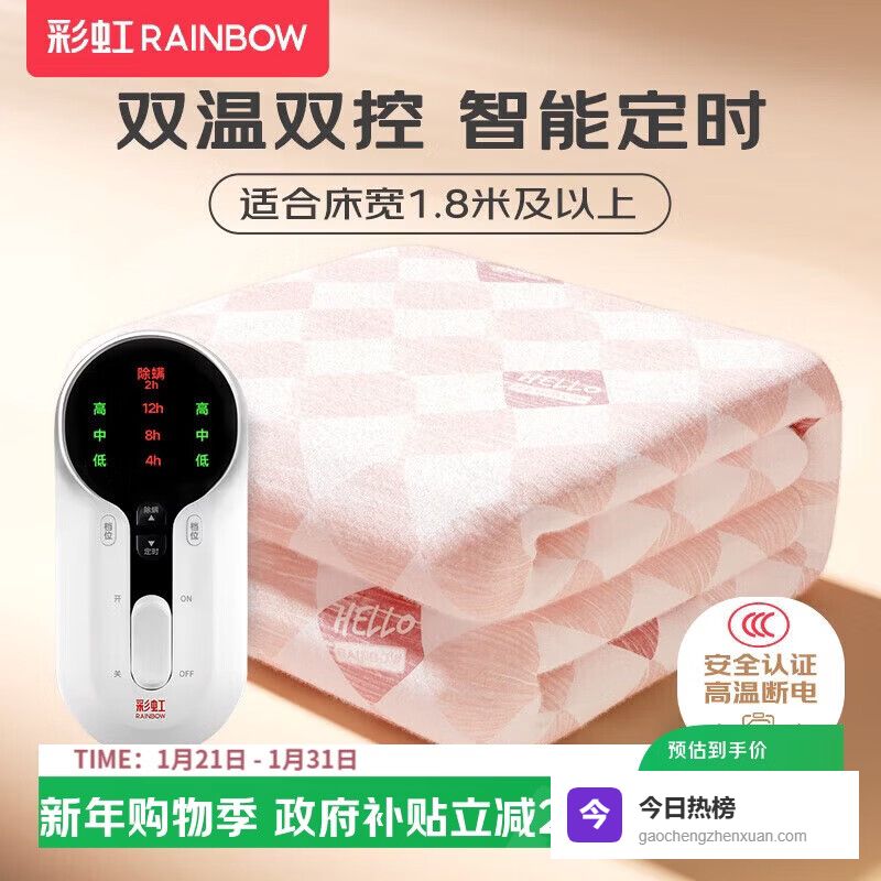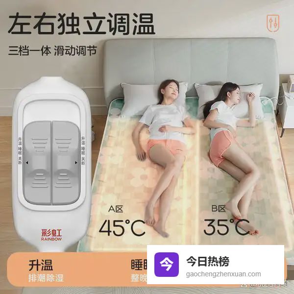 电热毯买哪个牌子的好,这几款型号性价比高一、彩虹生活彩虹生活这款电热毯采用双温双控技术,可以实现左右两侧的温度独立调节,满足不同人的偏好。操作相对简单,有三个档位可以选择,调整起来还算方便。面料使用无纺布,柔软又亲肤,整体设计注重用户的舒适体验。虽然不能水洗,但作为常规使用的电热毯,清洁和维护还是比较方便的。