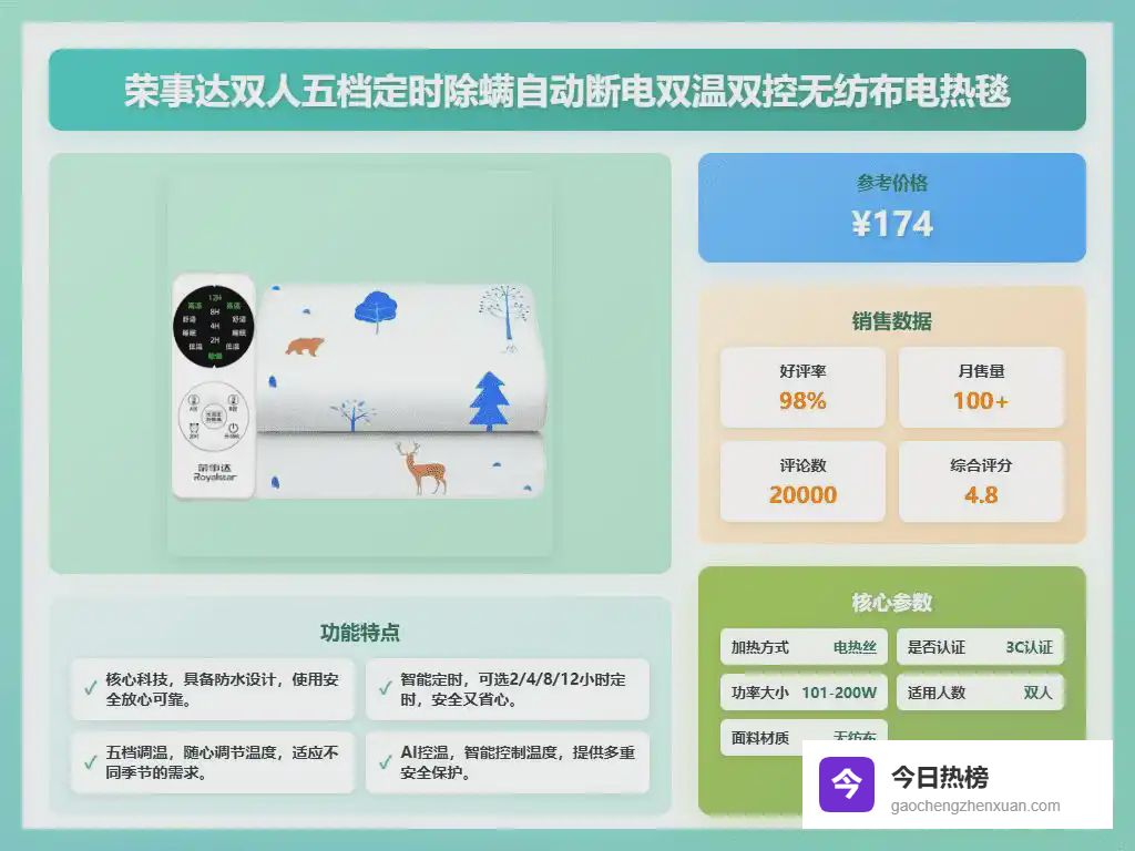 所以说,电热毯这东西,真的值得买!但“电热毯买哪个牌子的好”,确实是个需要好好研究的问题。我之前也踩过一些坑,终于摸索出了一些经验,选购的时候不能光看价格,更要关注材质、发热技术、安全性能等各个方面,这样才能选到一款质量安全又实惠的电热毯。下面给大家挑了10款,感兴趣的可以了解下。