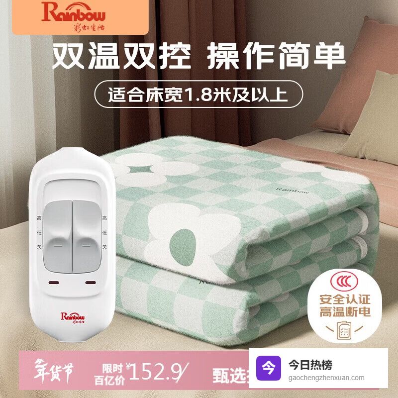 彩虹生活【高温断电】双人取暖排潮双温双控无纺布电热毯电褥子2*1.8米¥