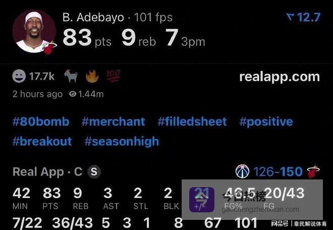 北京时间3月11日,热火对阵奇才一役,巴姆·阿德巴约出战约42分钟,43投20中、三分22投7中、罚球43罚36中,狂砍83分9篮板3助攻,以2分之差超越科比·布莱恩特2006年对阵猛龙的81分,登顶NBA历史单场得分榜第二位。