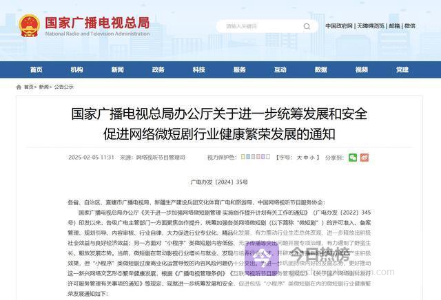 国家广播电视总局办公厅发布《关于进一步统筹发展和安全促进网络微短剧行业健康繁荣发展的通知》