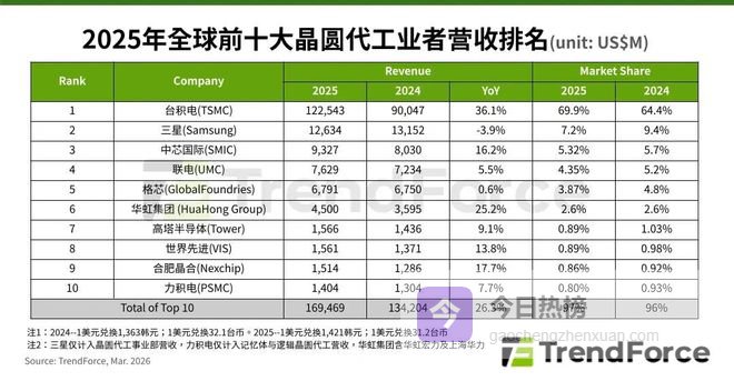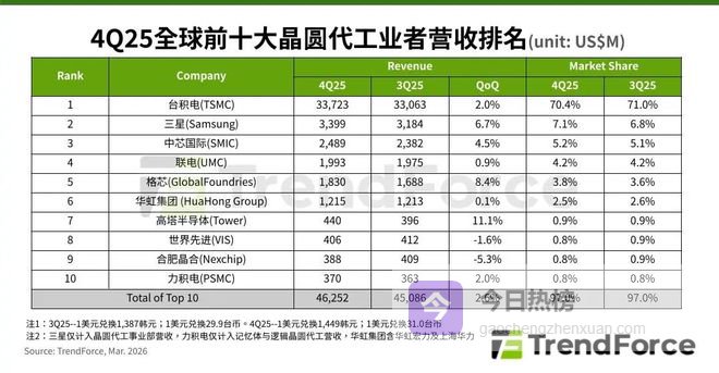Samsung Foundry(三星代工,排除System LSI)2025年第四季因2nm新品出货贡献营收,且自家HBM4使用的logic die晶圆亦开始产出,淡化整体产能利用率略降的不利因素,营收季增6.7%,近34亿美元,不仅正式转亏为盈,市占也从6.8%微幅升至7.1%,居第二名。
