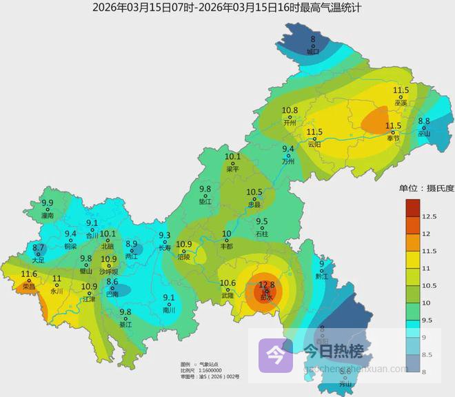 截至16时,全市气温集体“低迷”——所有区县最高气温均不足13℃,潼南、巴南、长寿、酉阳、万州等18个区县更是跌到10℃以下❄️。酉阳/城口成为今日“冻感双雄”,最高气温仅8℃;而彭水以12.8℃勉强拿下“最暖”称号,但也暖得有限……