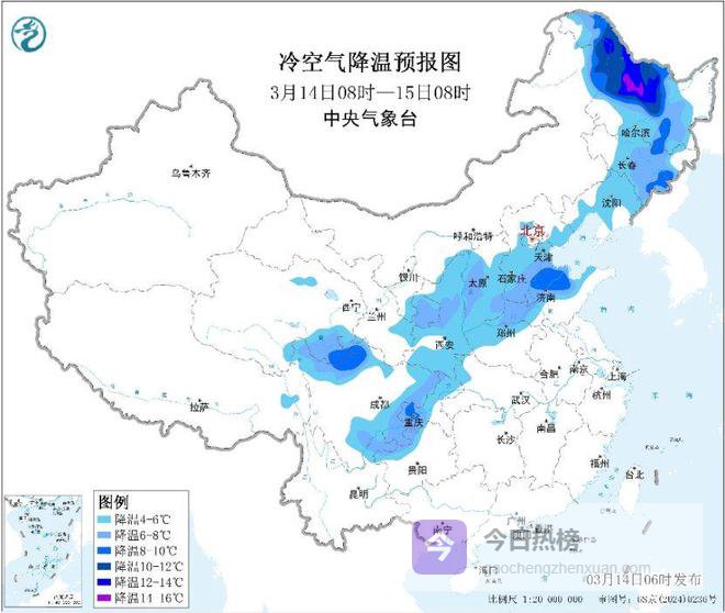 冷空气继续影响长江以北。14日至15日,受较强冷空气影响,西南地区东部及黄淮以北大部地区气温将下降4~6℃,西北地区东部、内蒙古中东部、黑龙江中西部等地降温6~10℃,局地降幅可达12℃以上;上述部分地区伴有4~6级风,阵风7~8级。
