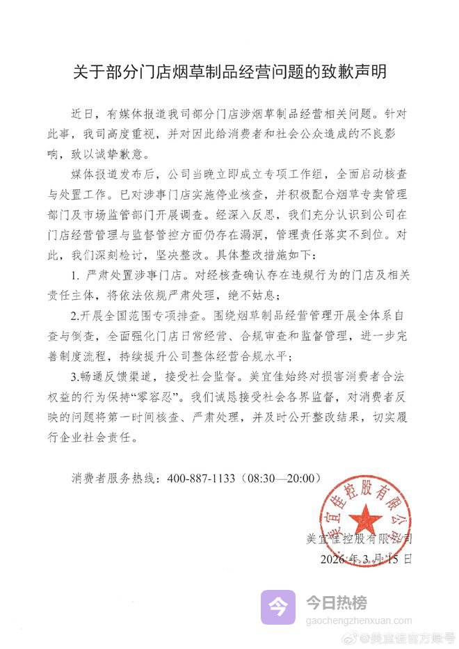 3月15日,美宜佳发布关于部分门店烟草制品经营问题的致歉声明:近日,有媒体报道我司部分门店涉烟草制品经营相关问题。针对此事,我司高度重视,并对因此给消费者和社会公众造成的不良影响,致以诚挚歉意。