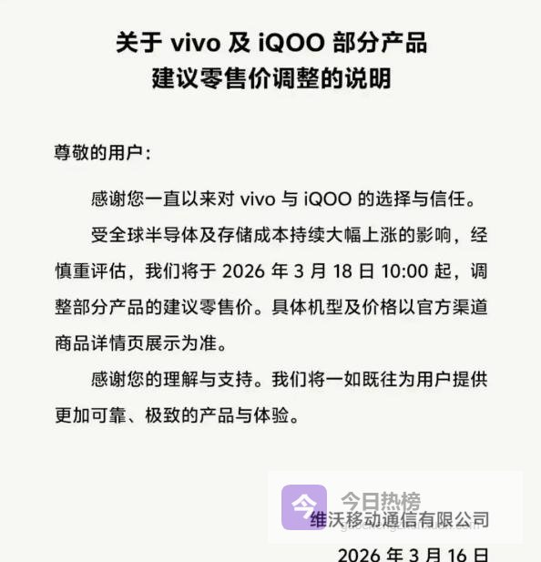 更扎心的是,就在今天,vivo也跟着官宣涨价,主品牌和iQOO多款机型,从3月18号起调整建议零售价,距离涨价就剩2天时间!虽然vivo没说具体哪款涨,但机哥用脚想都知道,受影响最大的肯定是千元到两千档机型。