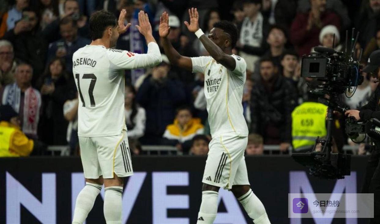 失去贝林厄姆的皇马在第15分钟取得了领先。 一次快速反击中,球到了前场左路的维尼修斯脚下。 他没有选择传球,而是直接带球内切,面对三名巴列卡诺防守球员的包夹,在禁区线上起右脚兜射,皮球划出一道弧线,直挂球门远角。 1-0,维尼修斯打破了个人长达13轮的西甲进球荒。 进球后,他跑到场边,亲吻了皇马队徽,然后面对客队球迷看台的方向,做出了倾听的手势,回应了之前比赛中遭受的一些嘘声。