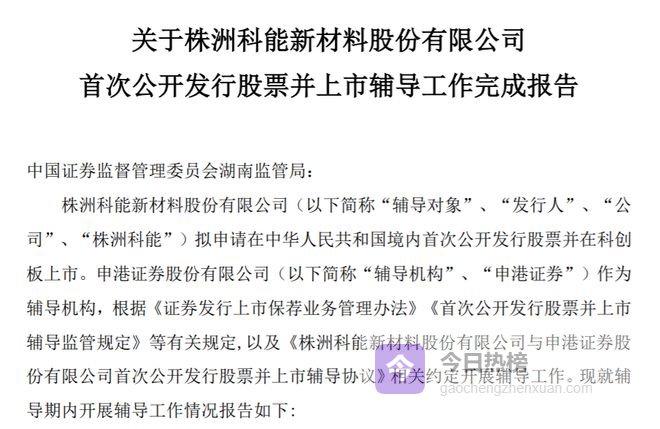 瑞财经 王敏3月16日,株洲科能新材料股份有限公司(以下简称“株洲科能”)披露科创板IPO辅导工作完成报告,历时4个月。