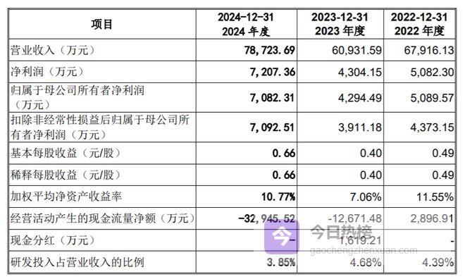 根据前次申报材料显示,2022年、2023年、2024年,株洲科能营收分别为6.79亿元、6.10亿元、7.87亿元;净利分别为5082万元、4304万元、7207万元。