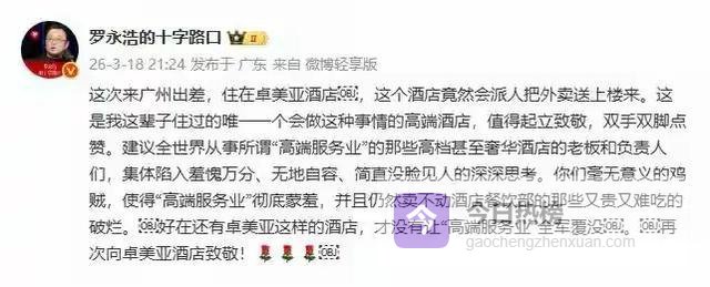 3月18日,罗永浩在广州出差入住卓美亚酒店,按他的原话,自己住过数不清的高端酒店,无一例外都要自己下楼取外卖,哪怕几万块一晚的套房也不例外。可卓美亚直接打破惯例,工作人员把外卖稳稳送到他房间门口,这份反差让老罗当场感慨:这是我这辈子住过的唯一一个会做这种事的高端酒店,还好有卓美亚,才没让高端服务业全军覆没。