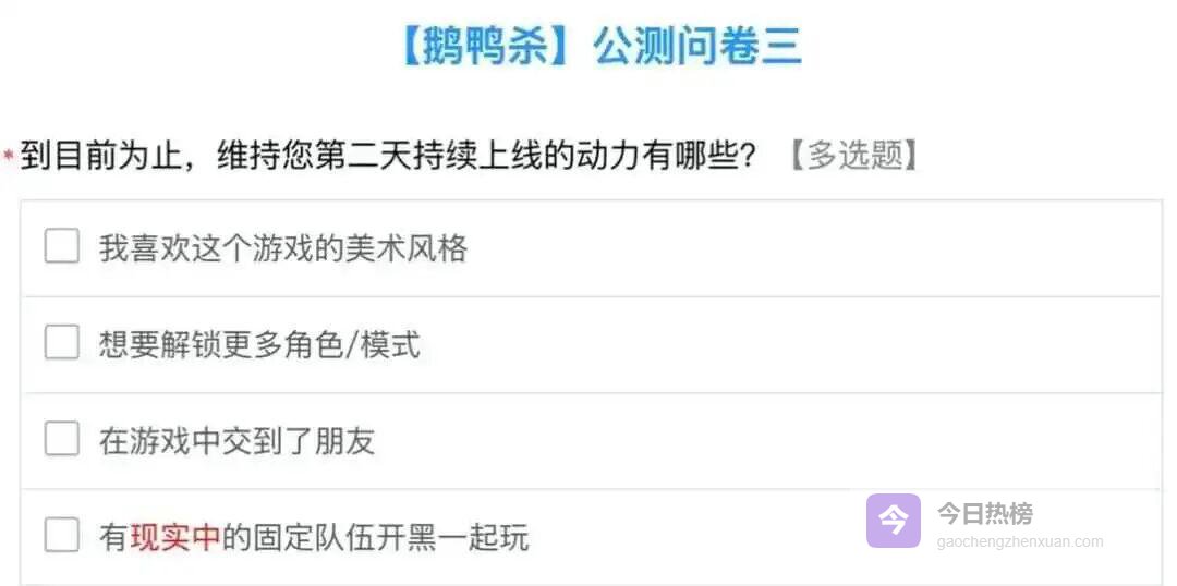 比如《鹅鸭杀》游戏界面的右上角有一个“问卷”按钮,用来收集公测期间的玩家反馈。其中一道多选题是:“到目前为止,维持您第二天持续上线的动力有哪些?”备选项做出了预判——在“喜欢这个游戏的美术风格”“想要解锁更多角色/模式”“在游戏中交到了朋友”“有现实中的固定队伍开黑一起玩”等答案中,社交属性占据了一定的比重。