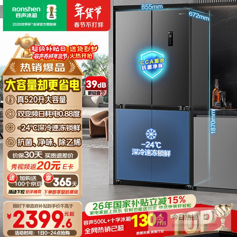 第2款:容声BCD-520WD12FP520L超大容量:这个冰箱容量是真的大,足足有520升,过年过节一次性能囤不少货,再也不用担心冰箱不够放啦。冷藏室和冷冻室空间都挺大的,感觉一家人用完全足够。