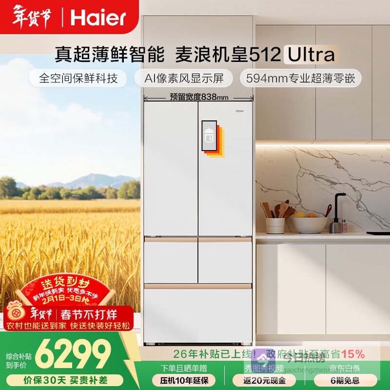 海尔(Haier)【年度机皇】麦浪512Ultra+法式五门母婴冰箱全空间保鲜超薄自动制冰BCD-512WGHMDBGVSU1国家补贴¥